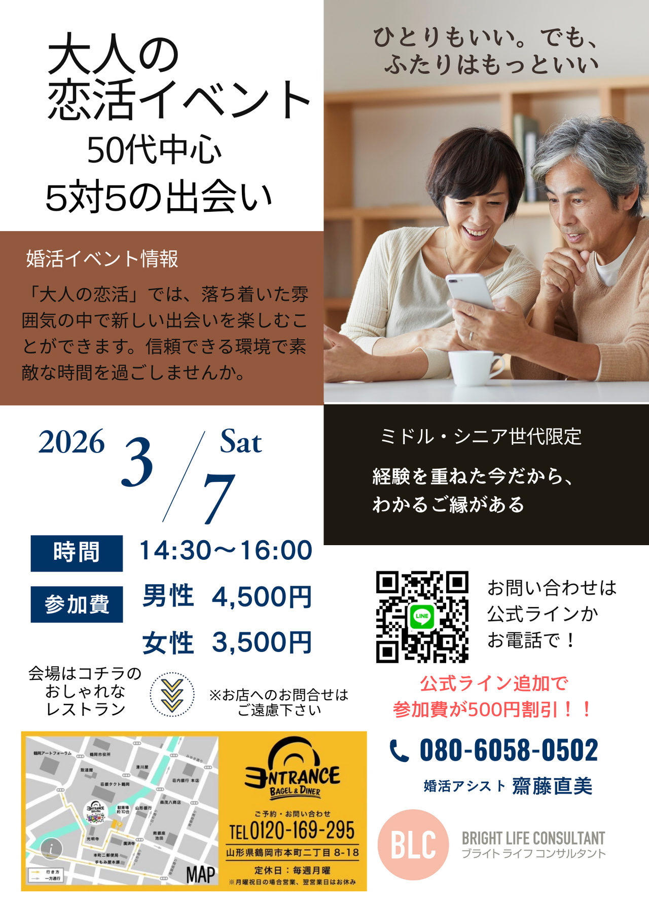 | 料金 | 男性4,500円 女性3,500円 ※公式ライン追加で参加費が500円割引 |