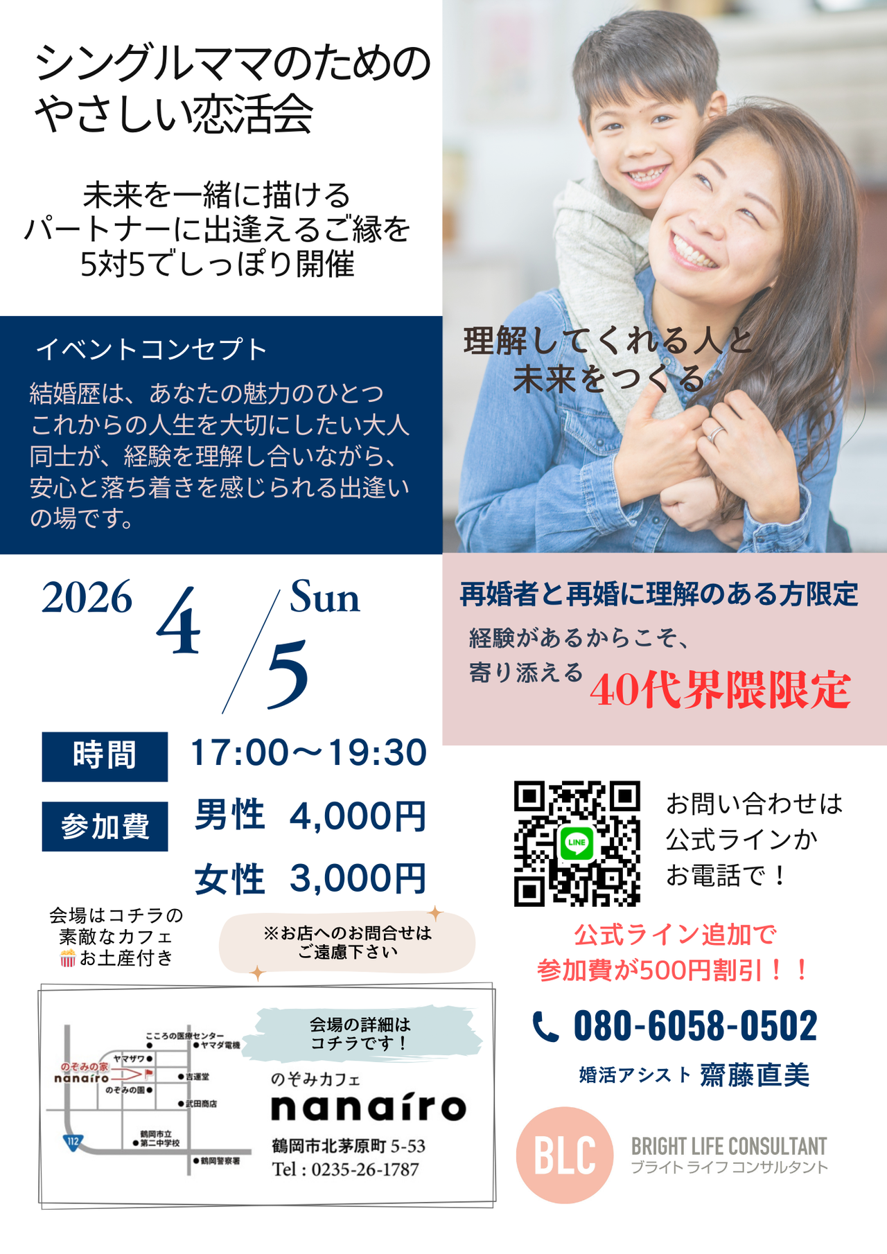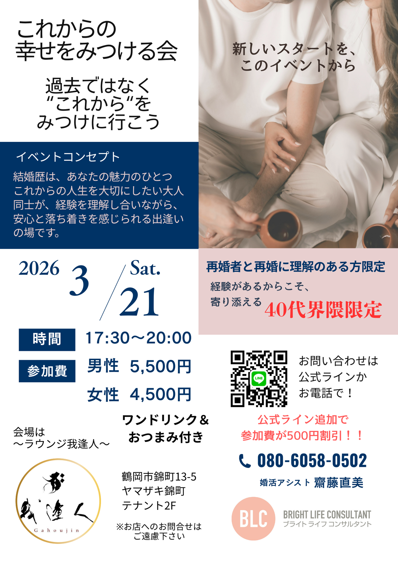 | 料金 | 男性4,000円 女性3,000円 ※公式ライン追加で参加費が500円割引 |
